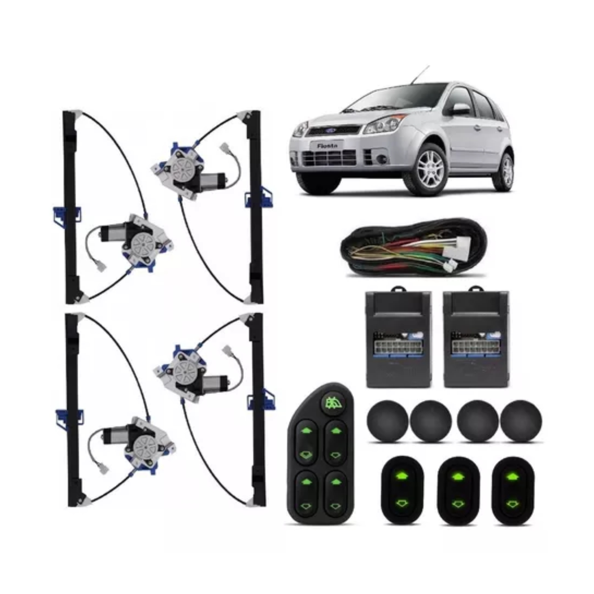 Seu fiesta merece a praticidade de um sistema de vidros automático, para isso adquira já o kit de vidro elétrico, feito com exclusividade para os vidros do seu ford. É um modelo sensorizado e inteligente, que conta com a qualidade dos motores mabuchi. Acompanha botão com led verde, chicote anti chamas, função anti vácuo, alívio de pressão e o temporizador, que garante a segurança do seu carro, fechando automaticamente os vidros 1 minuto após o fim da ignição