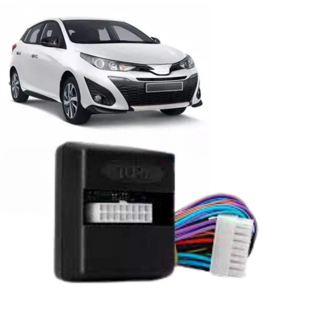 O modulo park421cl para o novo toyota yaris, foi desenvolvido para realizar o fechamento e abertura dos 4 vidros elétricos através do telecomando original, controle remoto original, e também fazer o rebatimento dos retrovisores através do telecomando, para carros que já possuem o rebatimento de fábrica além de preservar a função original de proteção contra esmagamentos